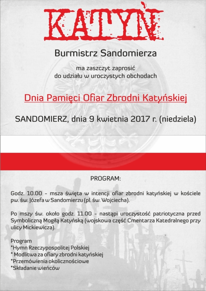 Burmistrz Miasta Sandomierza ma zaszczyt zaprosić do wzięcia udziału w uroczystych obchodach Dnia Pamięci Ofiar Zbrodni Katyńskiej. 9. kwietnia (niedziela) o godz. 10.00 w kościele pw. św. Józefa odbędzie się msza święta. Po niej nastąpi przemarsz na część wojskową Cmentarza Katedralnego.
