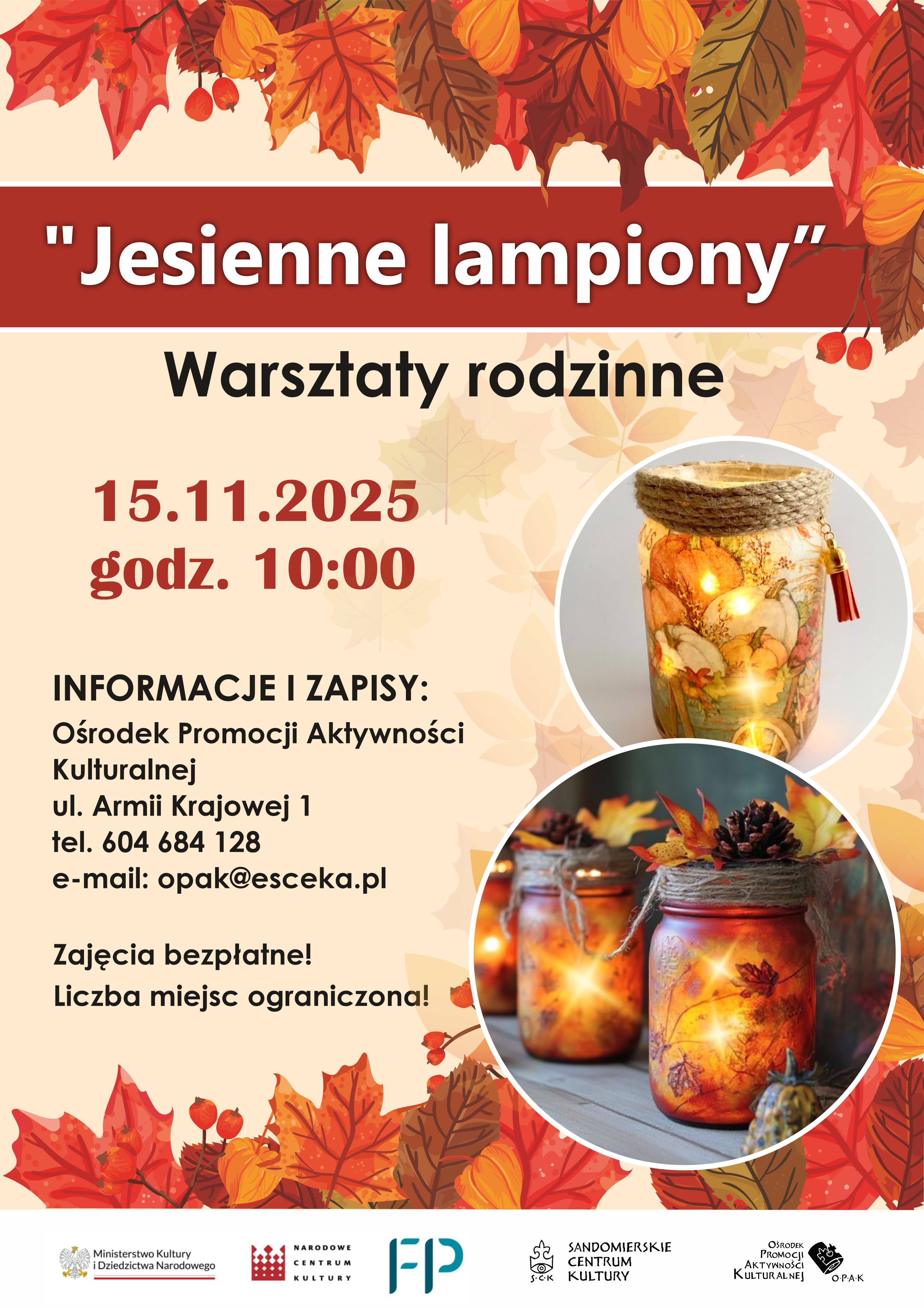 Sandomierskie Centrum Kultury zaprasza na rodzinne warsztaty Jesienne lampiony, które odbędą się 15 listopada 2025 roku o godz. 10:00 w Ośrodku Promocji Aktywności Kulturalnej w Sandomierzu.