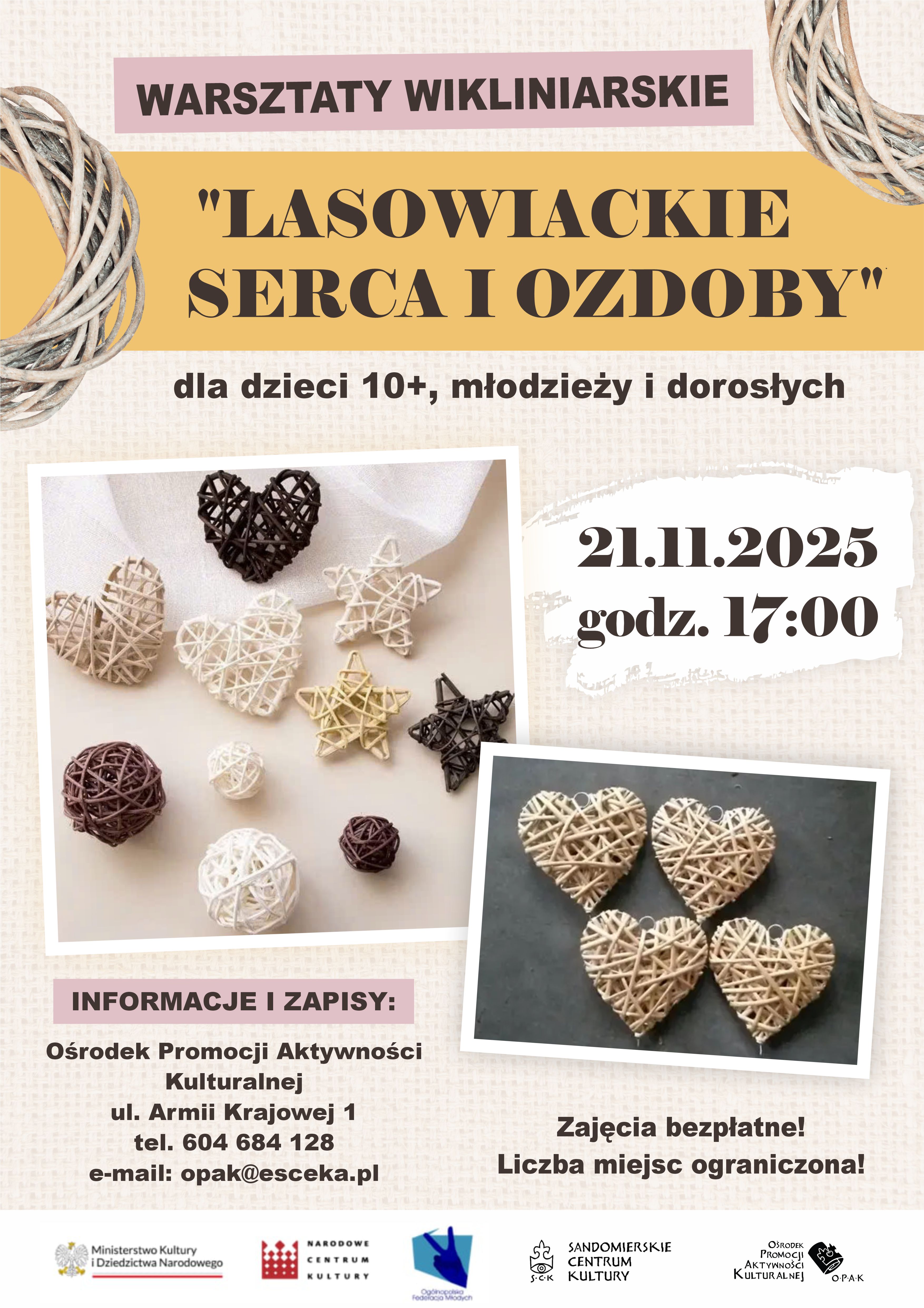 Serdecznie zapraszamy do udziału w warsztatach i wspólnego tworzenia lasowiackich serc oraz ozdób z wikliny!
