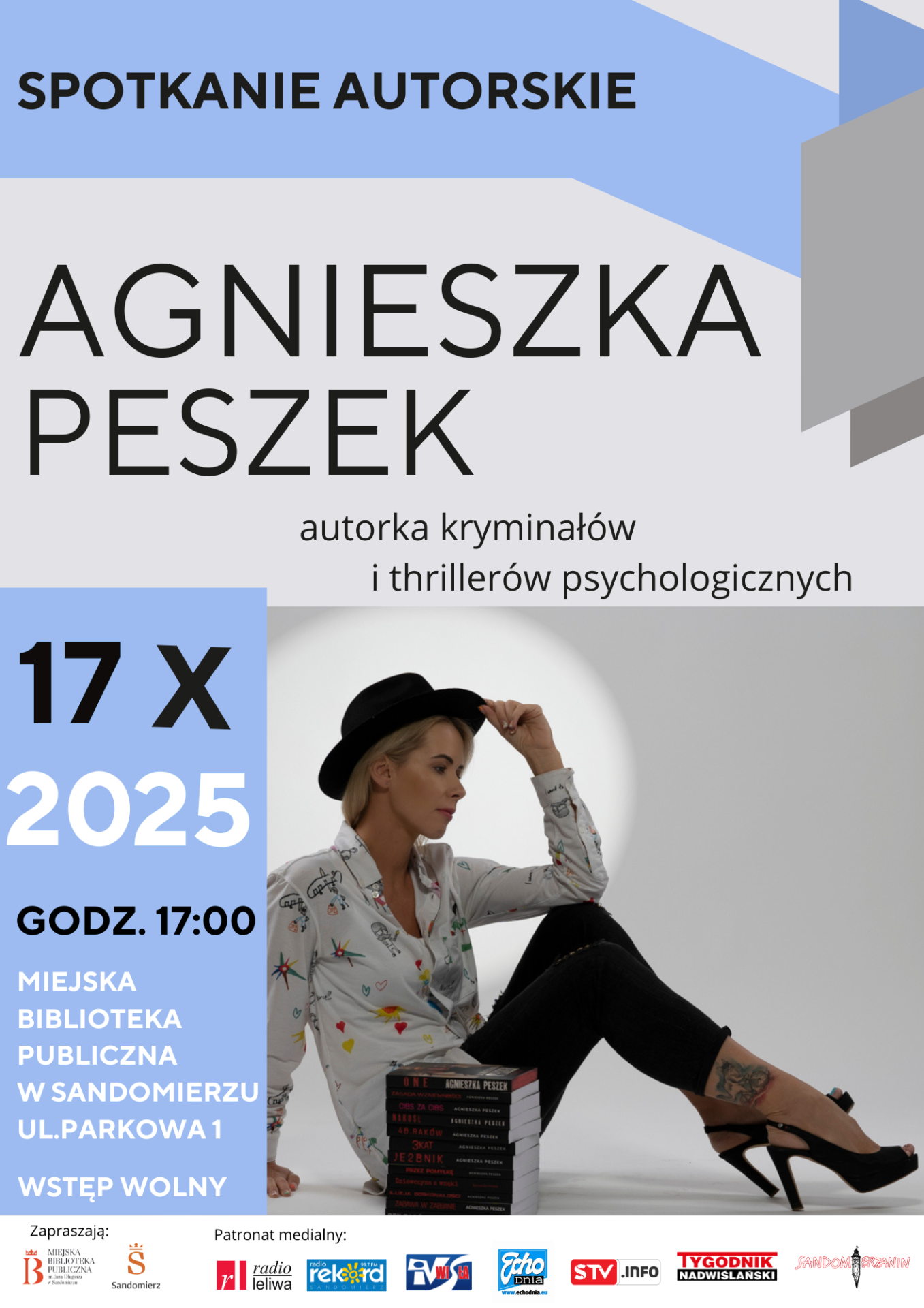 Miejska Biblioteka Publiczna w Sandomierzu zaprasza na spotkanie autorskie z Agnieszką Peszek, autorką poczytnych kryminałów i thrillerów psychologicznych, które odbędzie się w piątek, 17 października 2025 roku o godzinie 17:00 w siedzibie Biblioteki przy ul. Parkowej 1.