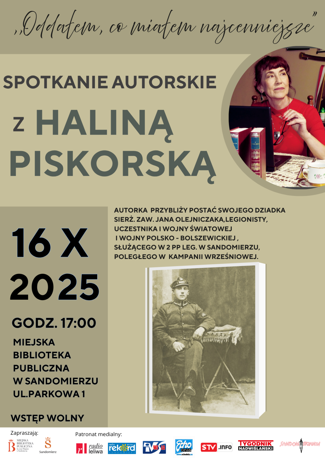 Miejska Biblioteka Publiczna w Sandomierzu zaprasza na spotkanie autorskie z Haliną Piskorską, które odbędzie się 16 października 2025 r. (czwartek) o godzinie 17:00 w siedzibie biblioteki przy ul. Parkowej 1.