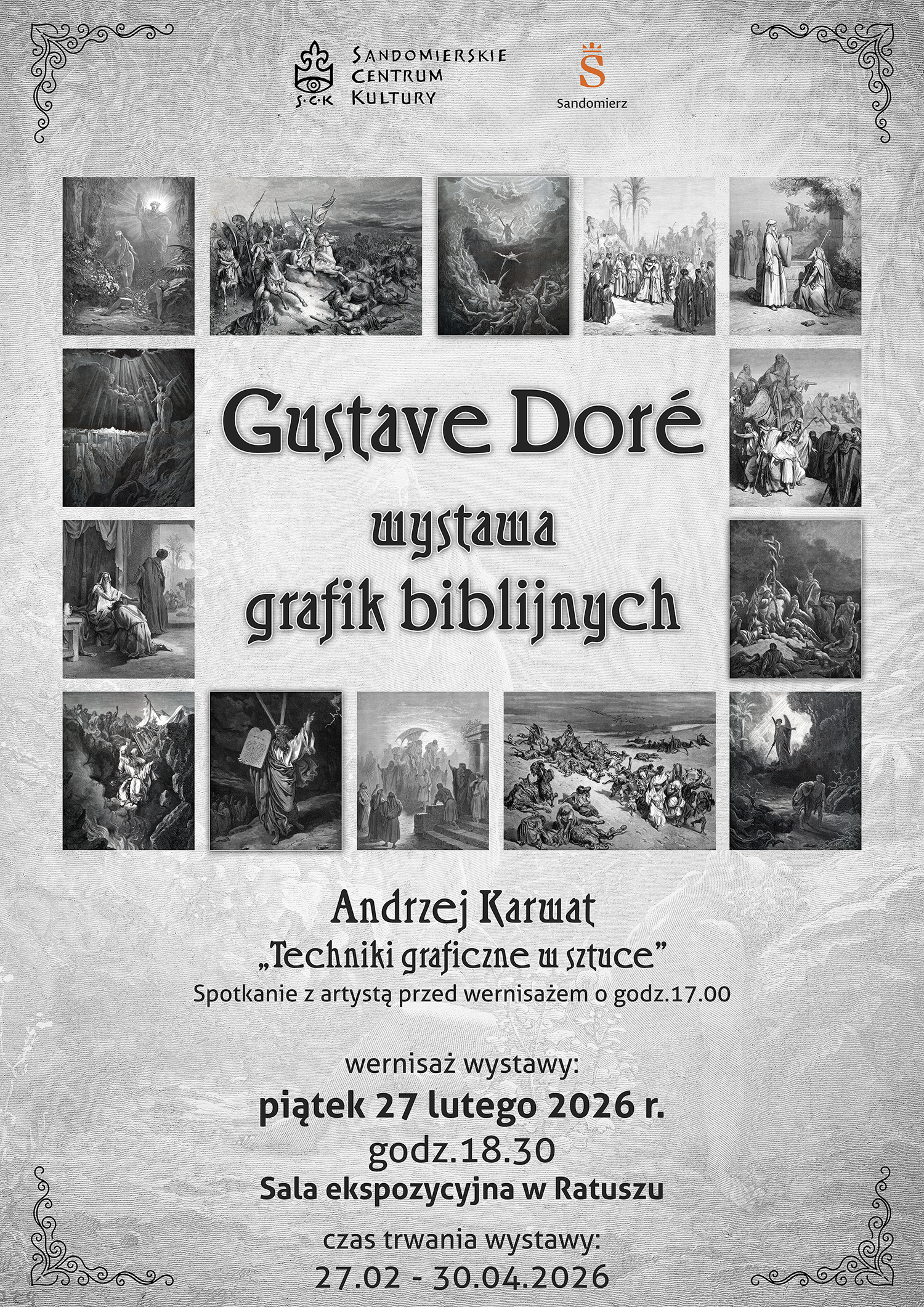 Na wystawie prezentowane będą grafiki opublikowane w dwóch tomach Pisma Świętego Starego i Nowego Testamentu w przekładzie księdza Jakuba Wujka, wydanych w Warszawie w 1873 roku. Publikację ozdabiało 230 ilustracji wykonanych w technice drzeworytu sztorcowego. Doré tworzył rysunki tuszem na blokach drewna, które następnie mistrzowie rytownicy przenosili na matryce. Dzięki temu powstały niezwykle precyzyjne, czarno-białe kompozycje o bogatych efektach światłocieniowych. Obok sygnatury artysty na grafikach widnieją także nazwiska rytowników, których praca była istotnym elementem procesu twórczego.