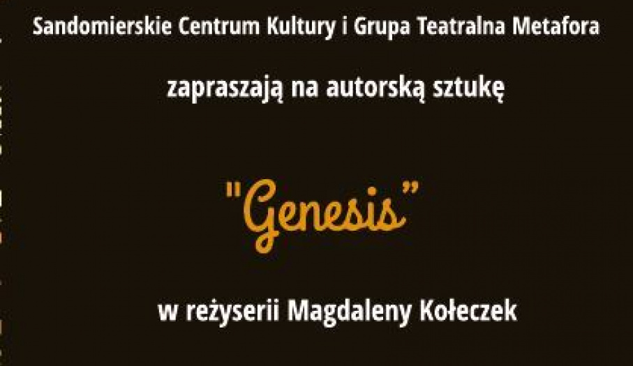 Sandomierskie Centrum Kultury i Grupa Teatralna Metafora zapraszają na spektakl teatralny "Genesis", który odbędzie się 29 sierpnia br. o godz. 19:00 w Centrum Rekreacji MOSiR (ul. Portowa 24). Wstęp jest wolny.