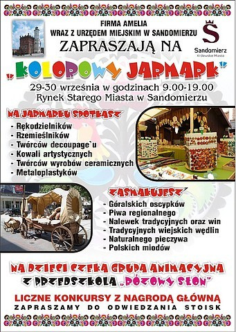 Serdecznie zapraszamy na "Kolorowy Jarmark", który odbywać będzie się w dniach 29-30 września br., w godz. 9:00-19:00 na Rynku Starego Miasta w Sandomierzu.